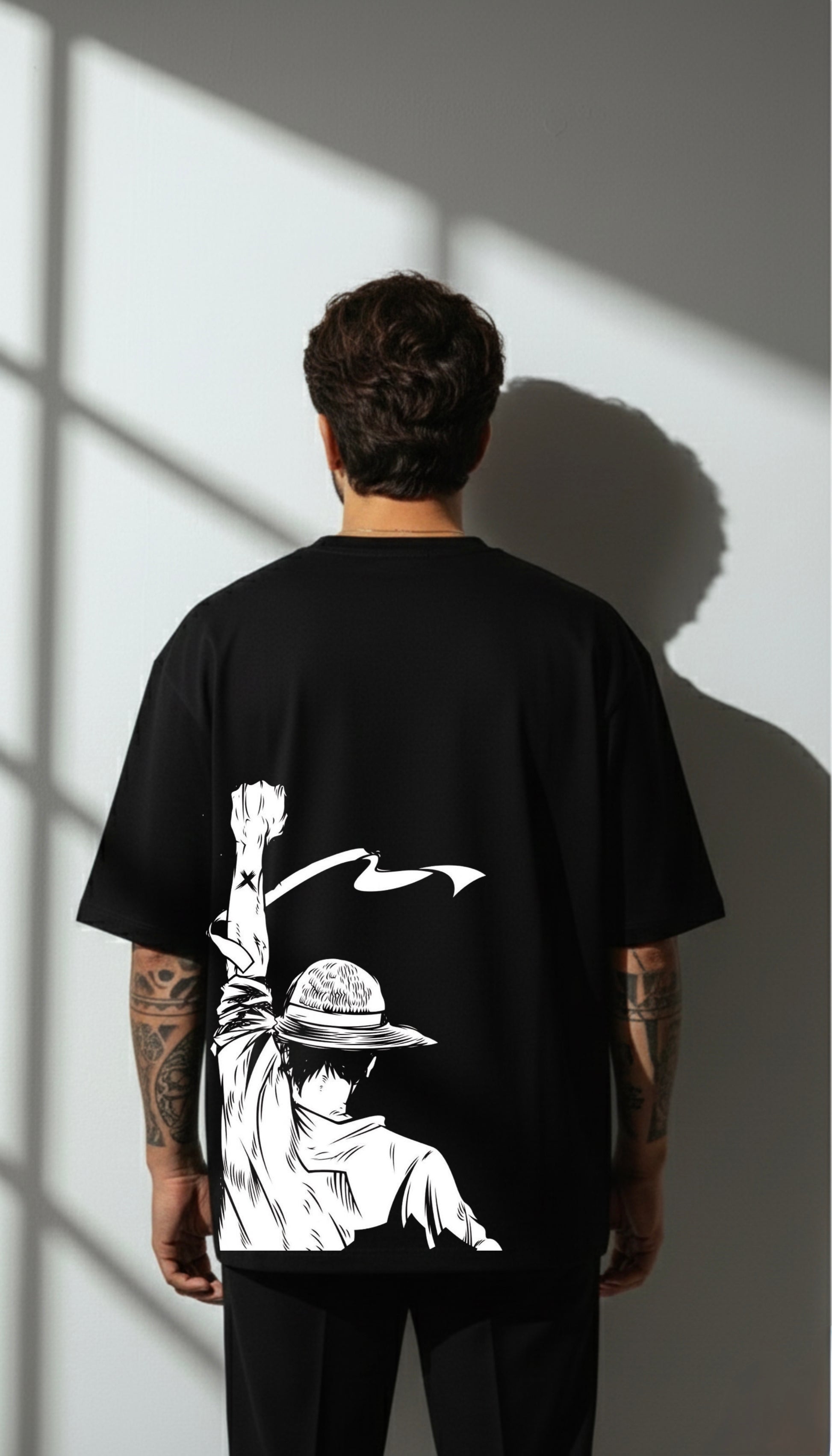 Wear the legacy of the Straw Hat Pirates with this double-sided, Oversized Tee. This piece combines a minimalist front aesthetic with one of the most powerful emotional landmarks in anime history on the back, making it a must-have for any One Piece fan.